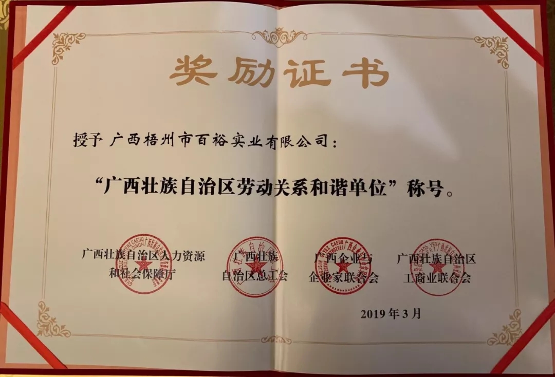 近日,百裕集團(tuán)先后榮獲“廣西壯族自治區(qū)勞動(dòng)關(guān)系和諧單位”、2018年度廣西壯族自治區(qū)“守合同重信用”企業(yè)稱號(hào)。