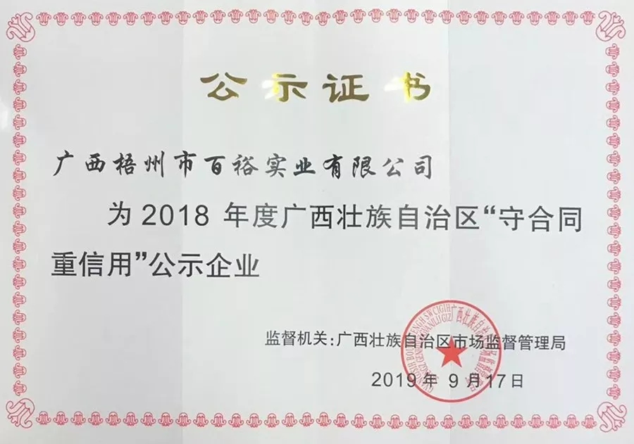 10月25日,百裕集團(tuán)獲得自治區(qū)市場監(jiān)督管理局授予的2018年度廣西壯族自治區(qū)“守合同重信用”公示企業(yè)稱號(hào),并授予獎(jiǎng)牌和證書。百裕連續(xù)多年獲此殊榮,這是主管部門對(duì)百裕在誠信經(jīng)營、體系建設(shè)以及維護(hù)合同信用等方面的充分肯定與認(rèn)可。公司始終堅(jiān)持誠信經(jīng)營、堅(jiān)守品質(zhì),樹立良好的口碑和企業(yè)形象