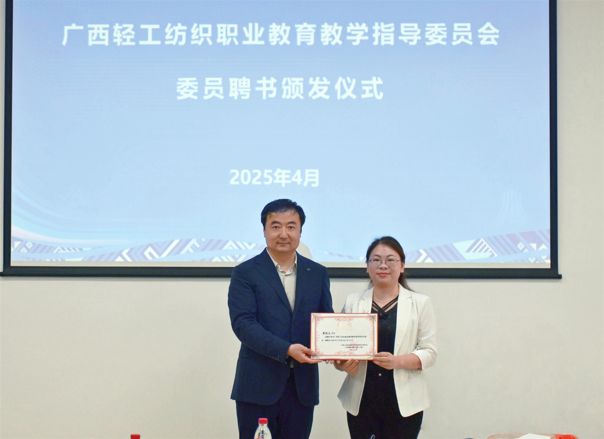 隨后,中國紡織服裝教育學(xué)會會長紀(jì)曉峰為百裕集團等委員代表頒發(fā)了廣西輕工紡織職業(yè)教育教學(xué)指導(dǎo)委員會委員聘書。