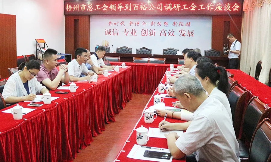 5月18日,梧州市總工會(huì)黨組書記、常務(wù)副主席謝善高、辦公室主任陳潔萍、勞經(jīng)部部長(zhǎng)呂星等領(lǐng)導(dǎo)蒞臨百裕調(diào)研指導(dǎo),重點(diǎn)了解基層工會(huì)建設(shè)情況、運(yùn)轉(zhuǎn)情況以及勞模創(chuàng)新工作等方面的工作情況。岑溪市人大副主任、工會(huì)主席謝梅、百裕世紀(jì)工會(huì)主席曾晏來陪同調(diào)研。