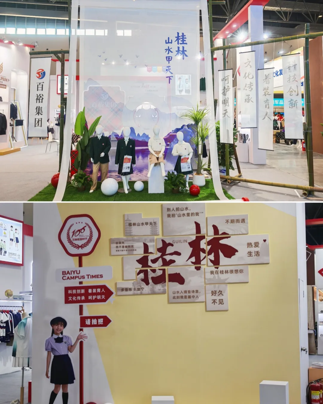 此次參展,百裕集團巧妙融合桂林地域文化特色,將“水墨丹青”系列校服產(chǎn)品置于沉浸式的桂林山水場景之中:一幅徐徐展開的靈動畫卷,將清新雅致的校服與詩意山水交相輝映,生動詮釋了校園服飾美學(xué)與地域文化傳承的完美結(jié)合,彰顯了百裕在校服設(shè)計領(lǐng)域的深厚功底與美學(xué)追求,展位還精心設(shè)計打卡區(qū),吸引了眾多參觀者駐足欣賞、拍照留念。
