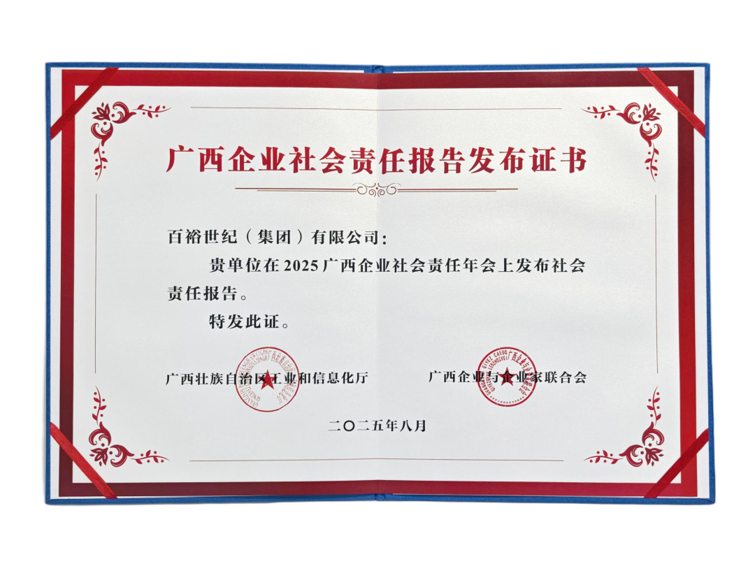 8月27日,由自治區(qū)工業(yè)和信息化廳、廣西企業(yè)與企業(yè)家聯(lián)合會(huì)共同主辦的2025廣西企業(yè)社會(huì)責(zé)任年會(huì)在南寧隆重舉行。會(huì)上發(fā)布了百裕集團(tuán)2024年度社會(huì)責(zé)任報(bào)告。