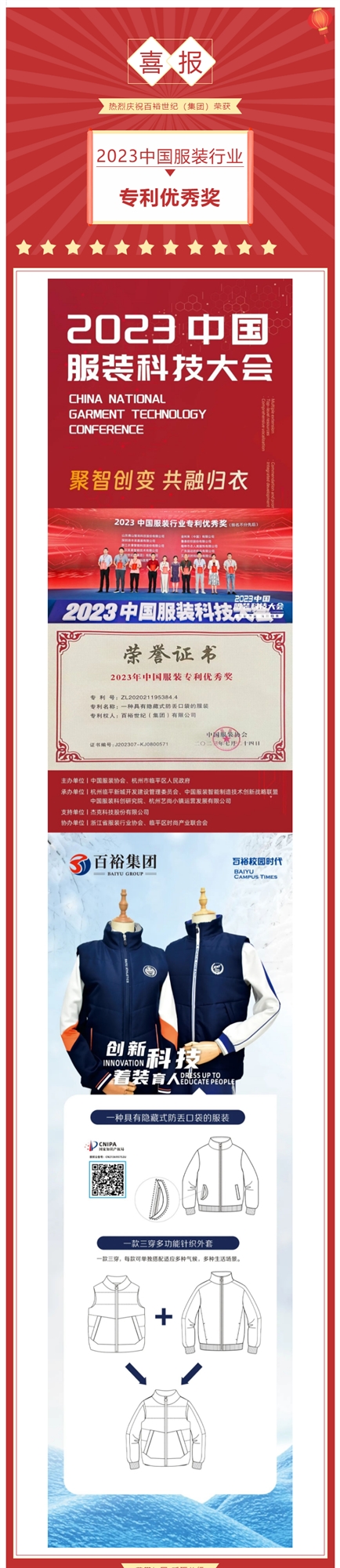 喜報 I 百裕世紀(jì)(集團(tuán))榮獲 2023中國服裝行業(yè)專利優(yōu)秀獎