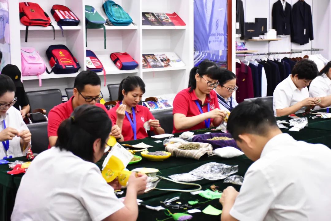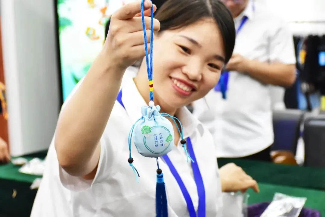 整個(gè)活動現(xiàn)場祥和喜樂,大家熱情高漲。伴隨著歡聲笑語,活動步入了尾聲,一個(gè)個(gè)精致的荷包出現(xiàn)在大家的手中,大家競相展示成果,分享喜悅,佩戴香囊合影留念。