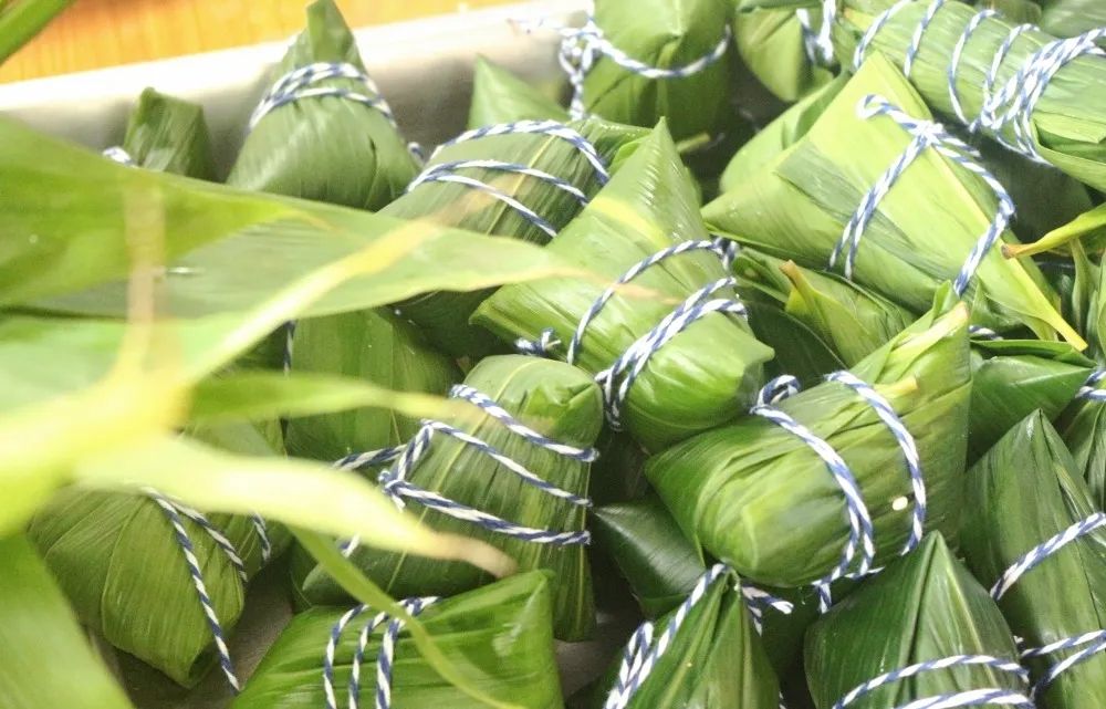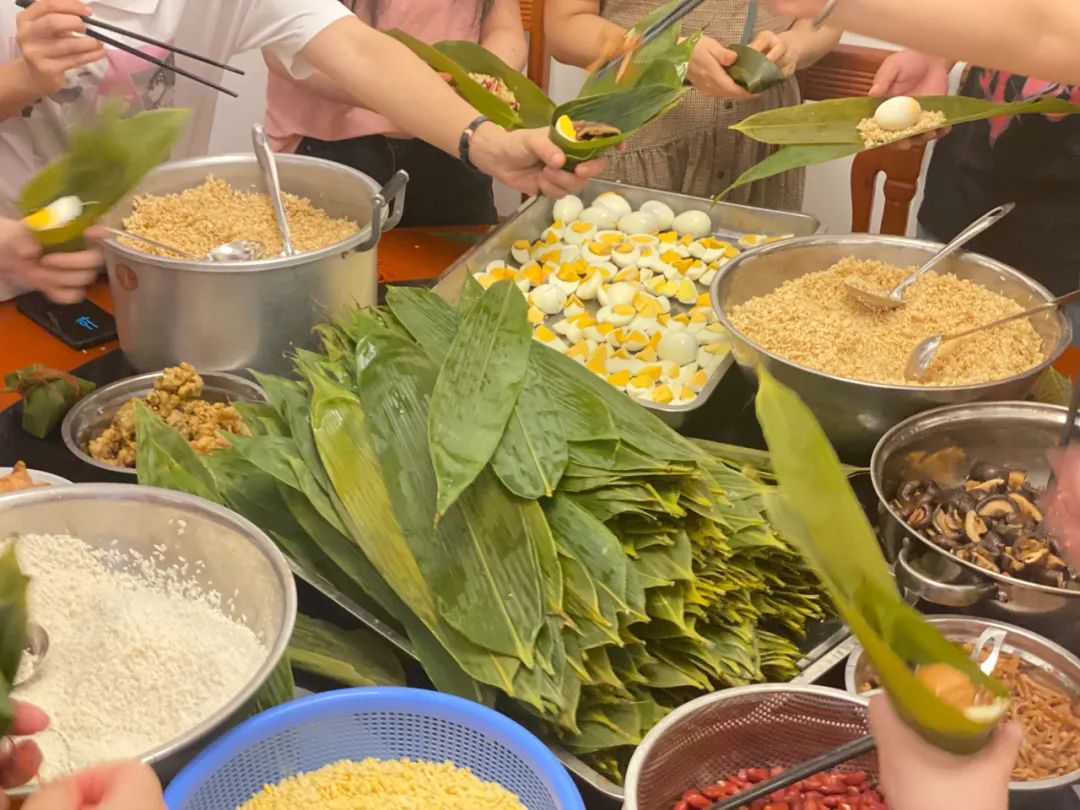 和心得,相互協(xié)作、其樂融融。填糯米、裹葉子、纏線,一雙雙巧手在歡聲笑語中舞動(dòng)著,一串串精致的粽子就這樣在大家手中誕生了。
