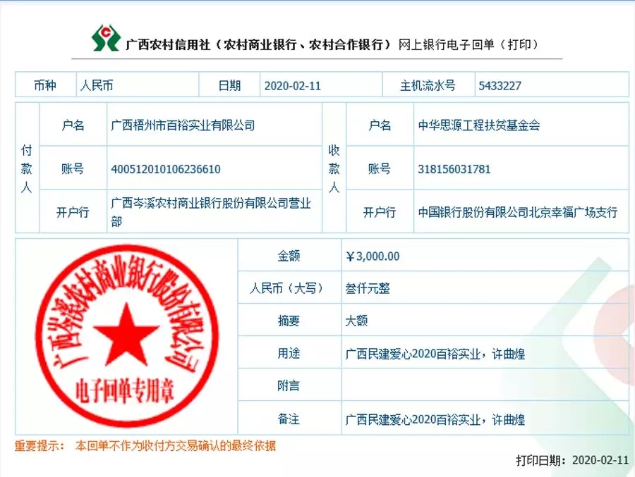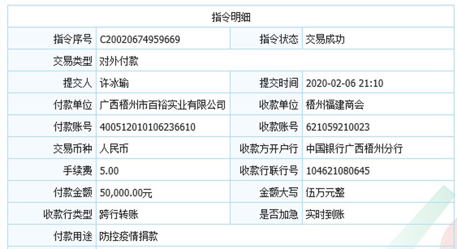 (向梧州福建商會捐款伍萬元)