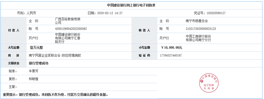 (向南寧市慈善總會捐贈壹萬元)